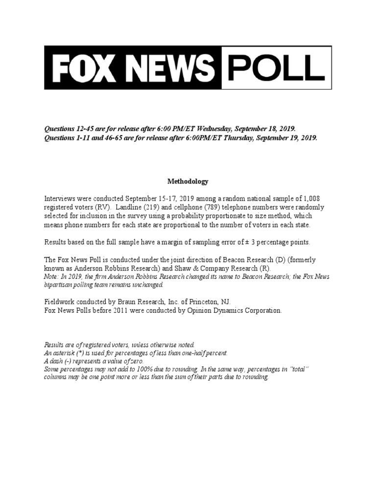 Fox News Poll Results September 15 17 2019 Pdf Opinion Poll Democratic Party United States